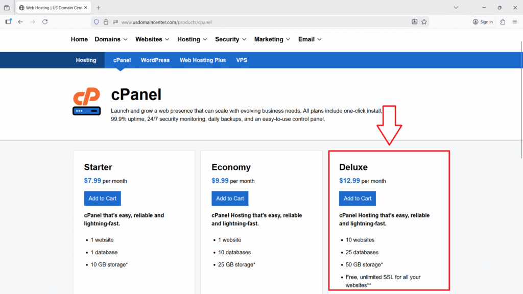 选择适合你的主机计划,推荐 Deluxe cPanel 主机。cPanel主机支持一键免费安装WordPress建站系统 (个人和商业使用都可以,无需另外再付费)。购买主机链接: http://www.usdomaincenter.com/products/cpanel