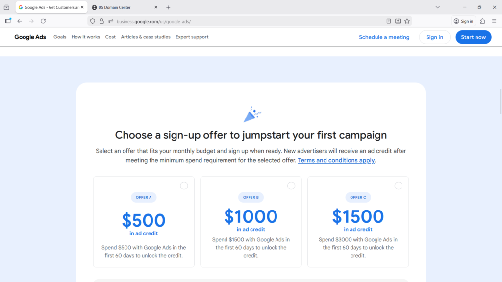 今天我们把三项最实用的资源放在一起讲清楚:一是 Google 对新广告主的赠金政策 (最高可达 $1500),二是用 US Domain Center 快速搭建一个专业网站的实操方法;三是用我们系统介绍七项关键的网络营销技巧,帮助你把广告预算与网站流量真正转化为客户与营收。